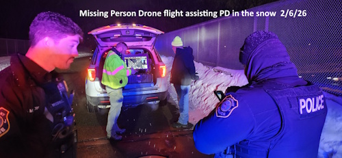 Police requested a drone search for a missing person in a wooded area at 10:30PM. CERT / RACES drone team volunteers responded with negative results. The person was found safe the next morning.